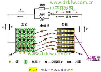 除鈷酸鋰電池外,其它常見的鋰離子電池的正極材料還有磷酸亞鐵鋰 (LiFePO4)、鎳酸鋰(LiNiO2)錳酸鋰(LiMn2O4)等。它們都是以鋁作為集流體(起承載電極、匯集電流的作用)。典型負(fù)極材料是石墨,采用銅作為集流體。工作原理與鈷酸鋰電池相同(如圖 2-6 所示)。