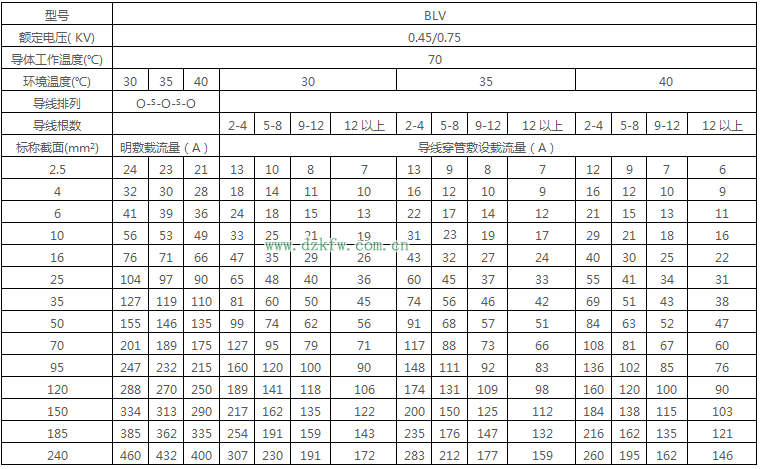BLV絕緣電線明敷及穿線管時(shí)持續(xù)載流量對(duì)照表