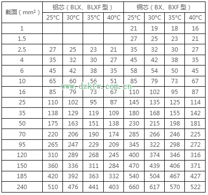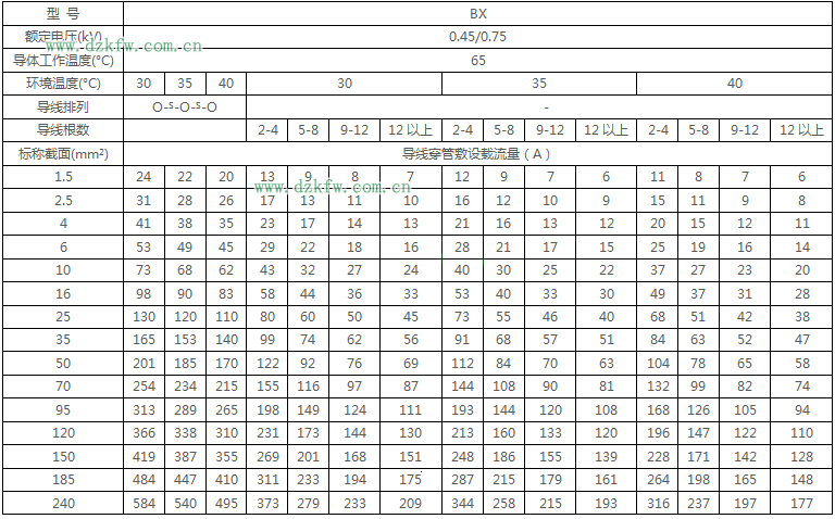 BLX絕緣電線明敷及穿線管時(shí)持續(xù)載流量對(duì)照表