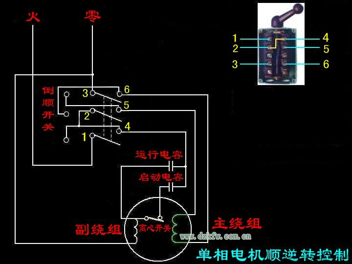 注明:此圖是簡單式接線方法,上面的9個(gè)圓點(diǎn)的是倒順開關(guān),接線時(shí)開關(guān)柄朝上。下面6個(gè)圓點(diǎn)的是電機(jī),電機(jī)轉(zhuǎn)軸方向向左。一般電機(jī)接好后試機(jī),倒順兩個(gè)方向都要試一下,如電機(jī)有異樣應(yīng)注意隨時(shí)拔掉插頭。另外:注意安全!