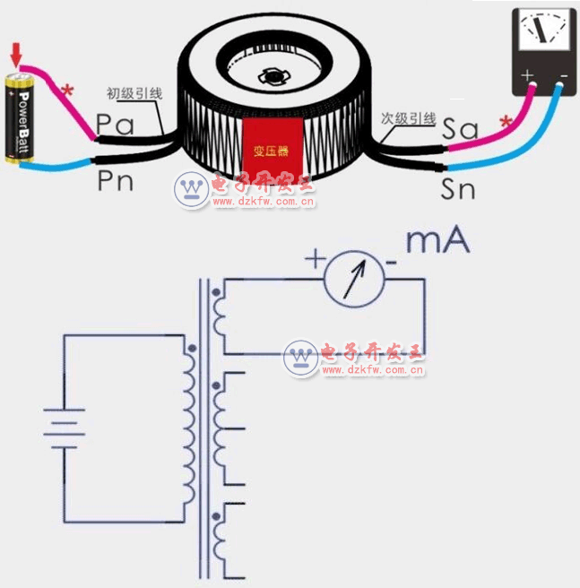 如果什么標記都沒有了,可以自行判斷,現場老工人經常說的“花進花出”的意思是初級側電流從某端流進,次級側電流就從同極性端流出。所以你用1.5V電池的負 極接至初級側的Pn端,次級側萬用表直流電壓檔(或毫安檔)的正端接于變壓器Sa端,表的負端接于Sn端,當電池的正極接通變壓器初級側Sa端的一瞬間,表計指針應該正方向擺動(即電流從Sa經過萬用表流向Sn),那么就說明Pa和Sa是同極性端。因為極性端在圖紙上都用星花“*”表示,所以為了好記就有“花進花出”一說。如果碰到變壓器有多組電壓的,也是一樣的判斷方法。根據測試的結果將同名端一一標記,即可得到想要的結果。