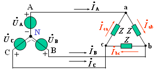 星形聯結(Y接)的(電源或負載):線電流等于相電流。