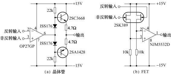 圖1.2(b)是在OP放大器IC的輸入端插入源極跟隨器,輸入電流非常小的電路(也有用FET輸入的OP放大器IC,使用分立的FET器件,對改善噪聲特性特別有利)。由于FET器件本身的輸入阻抗高,所以當希望改善IC的輸入特性時經常采用這種電路。