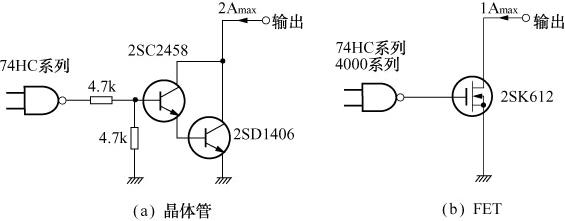 圖1.3是用數字電路IC的輸出驅動負載的開關電路中使用晶體管、FET的例子。也有這種開關電路的專用IC,不過使用晶體管或FET有時更加合理。
