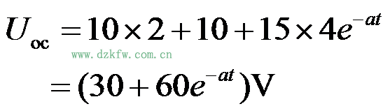 將二端網(wǎng)絡內的2A電流源和4e-αtA電流源分別用開路代替,10V電壓源用短路代替,得到圖(b)電路,由此求得戴維南等效電阻為 Req=10+5=15Ω。