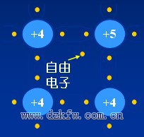(2)N型半導體:在硅(或鍺)的晶體內摻入少量的雜質,如磷(或砷、銻)等,就構成了N型半導體。摻入五價元素,形成一個自由電子。N型半導體中的電子成為多數載流子——多子,而空穴為少子。