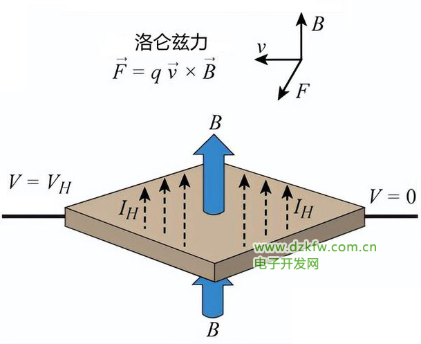 由于電荷載流子磁場的畸變,帶負電的電子將偏轉到板的一側,而帶正電的空穴將偏轉到板的另一側。在板的兩側之間會產生一個電位差,稱為霍爾電壓,可以用儀表測量。