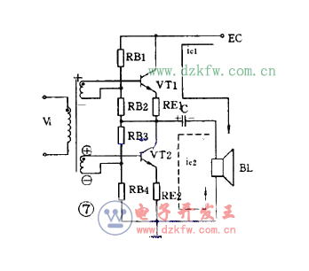 這個電路使用兩個特性相同的晶體管,兩組偏置電阻和發射極電阻的阻值也相同。在靜態時, VT1 、 VT2 流過的電流很小,電容 C 上充有對地為 1 2 E c 的直流電壓。在有輸入信號時,正半周時 VT1 導通, VT2 截止,集電極電流 i c1 方向如圖所示,負載 RL 上得到放大了的正半周輸出信號。負半周時 VT1 截止, VT2 導通,集電極電流 i c2 的方向如圖所示, RL 上得到放大了的負半周輸出信號。這個電路的關鍵元件是電容器 C ,它上面的電壓就相當于 VT2 的供電電壓。