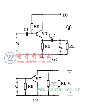 圖 3 ( a )是一個射極輸出器。它的輸出電壓是從射極輸出的。圖 3 ( b )是它的交流通路圖,可以看到它是共集電極放大電路。