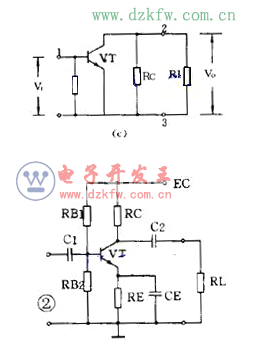 圖 1 ( a )是共發射極放大電路。 C1 是輸入電容, C2 是輸出電容,三極管 VT 就是起放大作用的器件, RB 是基極偏置電阻 ,RC 是集電極負載電阻。 1 、 3 端是輸入, 2 、 3 端是輸出。 3 端是公共點,通常是接地的,也稱“地”端。靜態時的直流通路見圖 1 ( b ),動態時交流通路見圖 1 ( c )。電路的特點是電壓放大倍數從十幾到一百多,輸出電壓的相位和輸入電壓是相反的,性能不夠穩定,可用于一般場合。