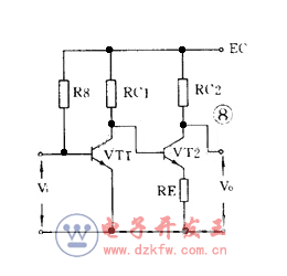 直流放大器不能用 RC 耦合或變壓器耦合,只能用直接耦合方式。圖 8 是一個兩級直耦放大器。直耦方式會帶來前后級工作點的相互牽制,電路中在 VT2 的發射極加電阻 R E 以提高后級發射極電位來解決前后級的牽制。直流放大器的另一個更重要的問題是零點漂移。所謂零點漂移是指放大器在沒有輸入信號時,由于工作點不穩定引起靜態電位緩慢地變化,這種變化被逐級放大,使輸出端產生虛假信號。放大器級數越多,零點漂移越嚴重。所以這種雙管直耦放大器只能用于要求不高的場合。