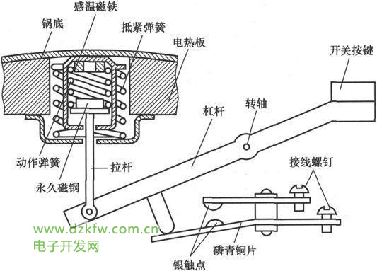 磁鋼磁性溫控器也叫磁鋼限溫器,俗稱磁鋼,主要應(yīng)用在電飯煲內(nèi)。它的作用是控制電飯煲煮飯時(shí)間的長短。常見的磁性溫控器的實(shí)物外形如圖3-3所示。磁性溫控器由感溫磁鐵、彈簧、永久磁鋼、拉桿、內(nèi)外套等構(gòu)成,它和開關(guān)按鍵構(gòu)成的供電控制系統(tǒng)如圖3-4所示。
