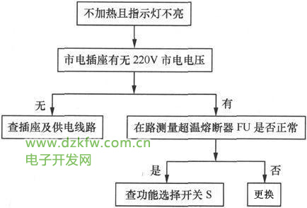 不加熱且指示燈不亮,說明溫度熔斷器FU、功能選擇開關(guān)S異常。該故障檢修流程如圖3-7所示。