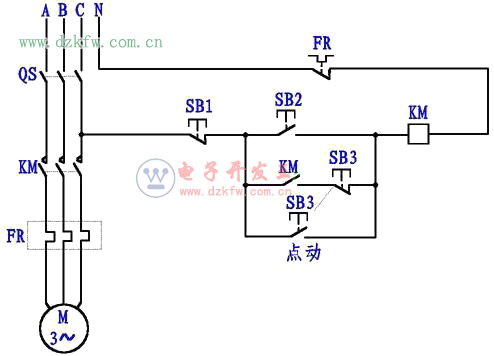 圖5,點動運行,按下SB3按鈕,KM得電吸合,但由于SB3常閉點斷開,接觸器不能自鎖。