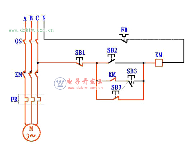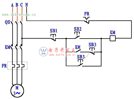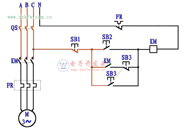 圖4,連續運行,按下SB2按鈕,KM線圈得電吸合,KM常開輔助觸點閉合,電流通過KM常開點和SB3常閉點使接觸器自鎖,電機連續運行。