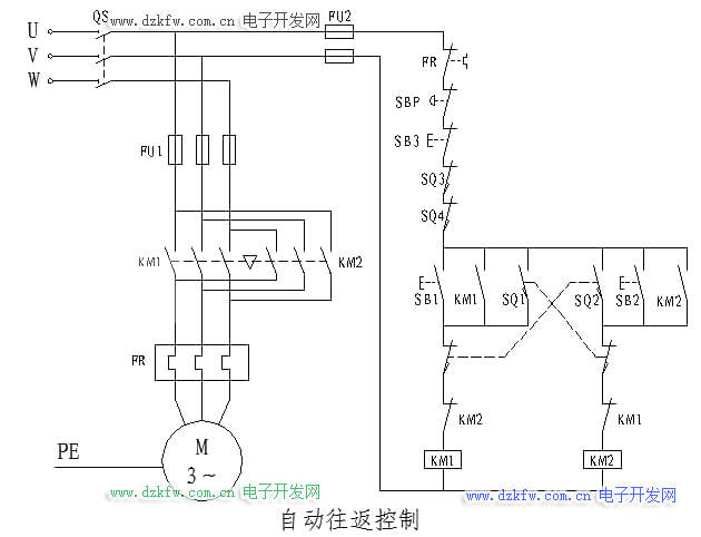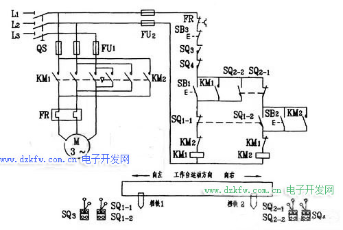 電動機自動往返控制線路的電路圖,由位置開關控制的工作臺自動往返控制線路,SB1、SB2分別作為正轉啟動按鈕和反轉啟動按鈕,若啟動時工作臺在左端,應按下SB2進行啟動。
