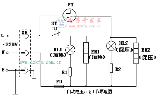 電壓力鍋工作原理是利用彈性元件受力作用發(fā)生變形產(chǎn)生位移,位移變化觸動(dòng)壓力開關(guān)動(dòng)作實(shí)現(xiàn)通、斷電;其結(jié)構(gòu)特征為:鍋蓋與外鍋剛性連接,通過(guò)外鍋底部的彈性元件實(shí)現(xiàn)鍋蓋、內(nèi)鍋與密封圈的軸向動(dòng)態(tài)密封即把鍋內(nèi)壓力變化轉(zhuǎn)變?yōu)殄伳懞桶l(fā)熱盤的位移變化,進(jìn)而觸動(dòng)固定在外鍋上的壓力開關(guān)動(dòng)作控制發(fā)熱盤的工作狀態(tài),把鍋內(nèi)的壓力控制在一定范圍。當(dāng)壓力開關(guān)出現(xiàn)故障不能斷開時(shí)鍋內(nèi)的壓力將迫使彈性元件產(chǎn)生更大的變形,其結(jié)果為:鍋蓋與內(nèi)鍋間隙加大,密封圈失去密封作用,水蒸汽從鍋蓋與內(nèi)鍋間的間隙排出,從而把鍋膽內(nèi)的壓力控制在安全的范圍內(nèi),徹底解決了電壓力鍋的安全問題。