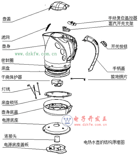 說明電熱水壺處于斷路狀態,首先要檢修電路。由于電熱水壺結構較簡單,一般人都能打開。對于沒有經驗的人,可以在打開的過程中對水壺結構進行拍照,以免維修完不能很好的組裝起來。好了,來看看怎么維修吧。