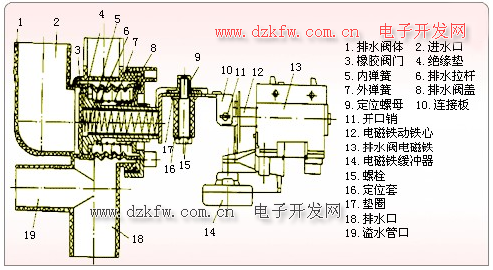 洗衣機排水牽引器主要由排水閥體、電磁機構、排水口和溢水管口等組成,其中電磁機構包括電磁鐵動鐵心、排水閥電磁鐵和電磁鐵緩沖器,牽引器通過電磁鐵的吸合松開完成機械運動。