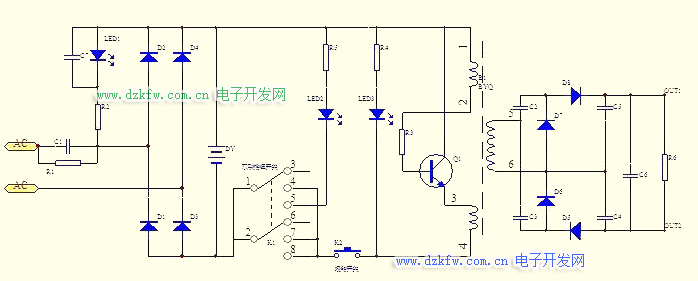 此款是帶有充電功能的電蚊拍,前半部分為簡單的充電電路主要由4個二極管和一個發光二級管構成,當電源充電完成時LED1發光。后半部分電路也由高頻振蕩電路、四倍壓的整流電路和高壓電網組成。