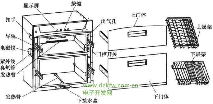 消毒裝置是消毒柜的核心部分,是主要的功能部件之一。它主要由紅外線加熱管、臭氧發生器、紫外線管、熒光燈座、鎮流器、輝光啟動器等組成。紅外線加熱管用于高溫消毒、臭氧發生器和紫外線管用于低溫消毒和烘干。