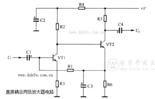 第一級放大管VT1集電極與第二級放大管VT2基極直接相連,所以是直接耦合放大器。VT1和VT2的信號都從基極輸入,從集電極輸出,所以是共發-共發雙管直接耦合放大器電路。