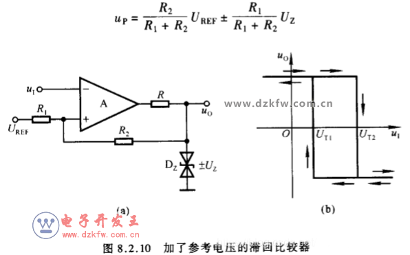 (2)、寫出集成運放同相輸入端、反向輸入端電位Up和Un的表達式,令Up=Un,解得輸入電壓Ui就是閾值電壓Ut;
