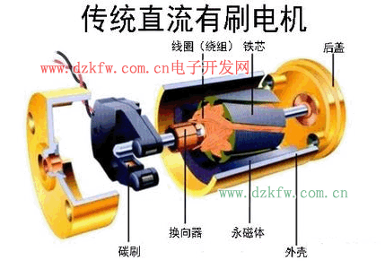 有刷電機是采用機械換向,外部磁極不動內部線圈動,電機工作時,換向器和線圈一起旋轉,碳刷與磁鋼都不動,于是換向器和碳刷產生摩擦,完成電流方向切換。