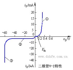 正向特性表現為圖中的①段。此時正向電壓較小,正向電流幾乎為零。此工作區域稱為死區。Vth稱為門坎電壓或死區電壓(該電壓硅管約為0.5V,鍺管為0.1V)。當正向電壓大于Vth時,內電場削弱,電流因而迅速增長,呈現出很小的正向電阻。