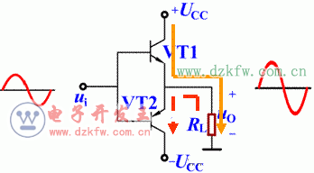 在 ui 負半周, VT2 發(fā)射結(jié)正偏導通, VT1 截止。