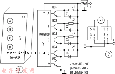 電路如附圖所示:S為四位無線遙控發射器,Y為與發射器配對的接收模塊。Y的各輸出端經BG1~BG5放大后,將四路互鎖存數據控制輸出端信號轉換成非鎖存形式,并通過繼電器J1~J4對電機M1、M2進行正反控制。M1控制主音量,M2控制高低音調。見圖1所示,其中電機M2電路相同,工作原理一樣,所以未繪出。當按下發射器S的A鍵時,Y的輸出端A和Io端輸出高電平,BG1和BG5導通。J1吸合,M1得電工作,手松開后,Io輸出消失,J1斷電電機M1釋放停轉。同樣,按下B、C、D鍵時,分別控制M1、M2反轉、正轉、反轉。