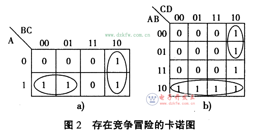 在進(jìn)行邏輯電路設(shè)計時,我們必須應(yīng)發(fā)現(xiàn)和判別出產(chǎn)生競爭冒險的可能,并采取積極有效的措施將競爭冒險予以消除。判斷和消除競爭冒險的方法很多,最簡便和最直觀的方法就是使用卡諾圖。