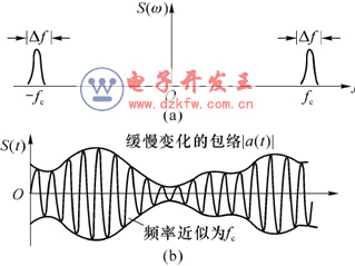 窄帶隨機過程的定義借助于它的功率譜密度的圖形來說明。圖3.5.1(a)中,波形的中心頻率為