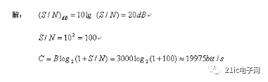 例2:已知僅存在加性高斯白噪聲的信道容量為33.6Kbit/s,其信號噪聲功率比為30db,求此模擬信道的帶寬為多少?