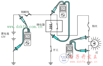 通常情況下,僅從外觀觀察很難發現電氣系統內存在故障點,所以了解電路的電壓以便發現故障是非常重要的。下面用幾個萬用表測量的示意圖說明問題。