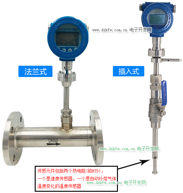 插入式熱式氣體質量流量計采用熱擴散原理,熱擴散技術是一種在苛刻條件下性能優良、可靠性高的技術,其典型傳感元件包括兩個熱電阻(鉑RTD),一個是速度傳感器,一個是自動補償氣體溫度變化的溫度傳感器。當這兩個RTD被置于介質中時,其中速度傳感器被加熱到環境溫度以上的一個恒定的溫差,另一個溫度傳感器用于感應介質溫度。流經速度傳感器的氣體質量流量是通過傳感元件的熱傳遞量來計算的。氣體速率增加,傳感器傳遞給介質的熱量增多,因此需要供給更多的功率,而電子單元加熱RTD 的功率與質量流量成一定的對應關系。