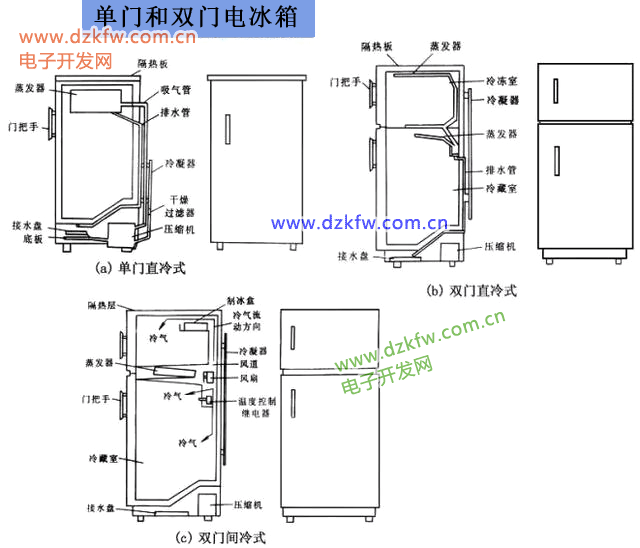 冷凍室和冷藏室公用一個門,蒸發器裝在電冰箱的上部,并圍成一個腔體,即冷凍室。下面冷藏室內依靠冷空氣下降、熱空氣上升的自然對流進行熱交換。