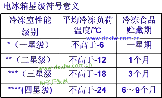 (4)按冷凍室溫度分類 1、2、3、4星級,每星-6℃。
