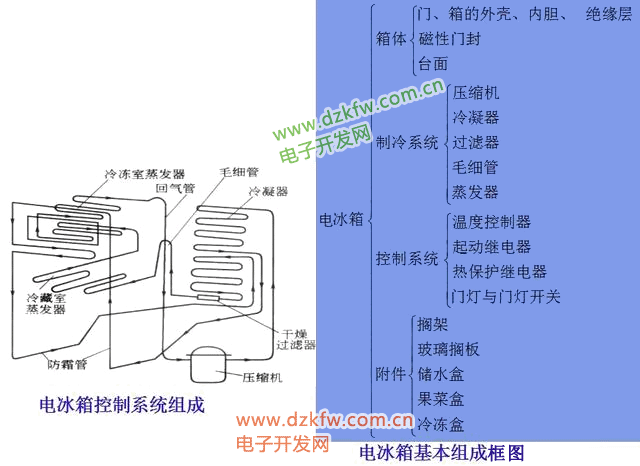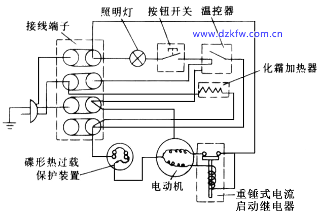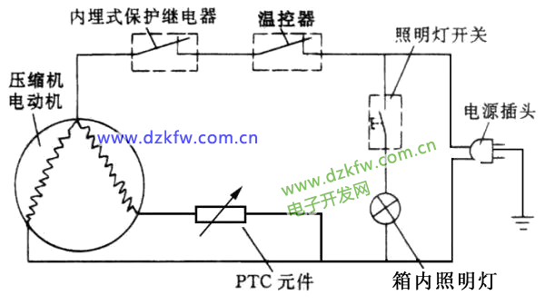 壓縮機控制電路是指從電源插頭→溫控器→化霜定時器→過載保護器→壓縮機→PTC啟動繼電器及電容器和電源插頭的一條回路。