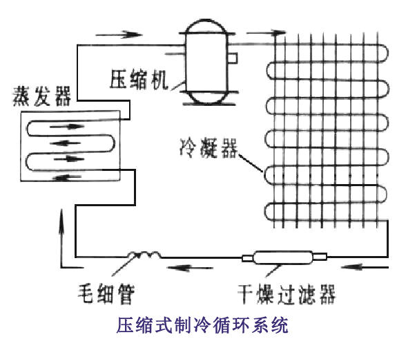 電冰箱的基本組成和制冷系統如圖示:由壓縮機、冷凝器、干燥過濾器、毛細管、蒸發器、連接管和制冷劑組成。